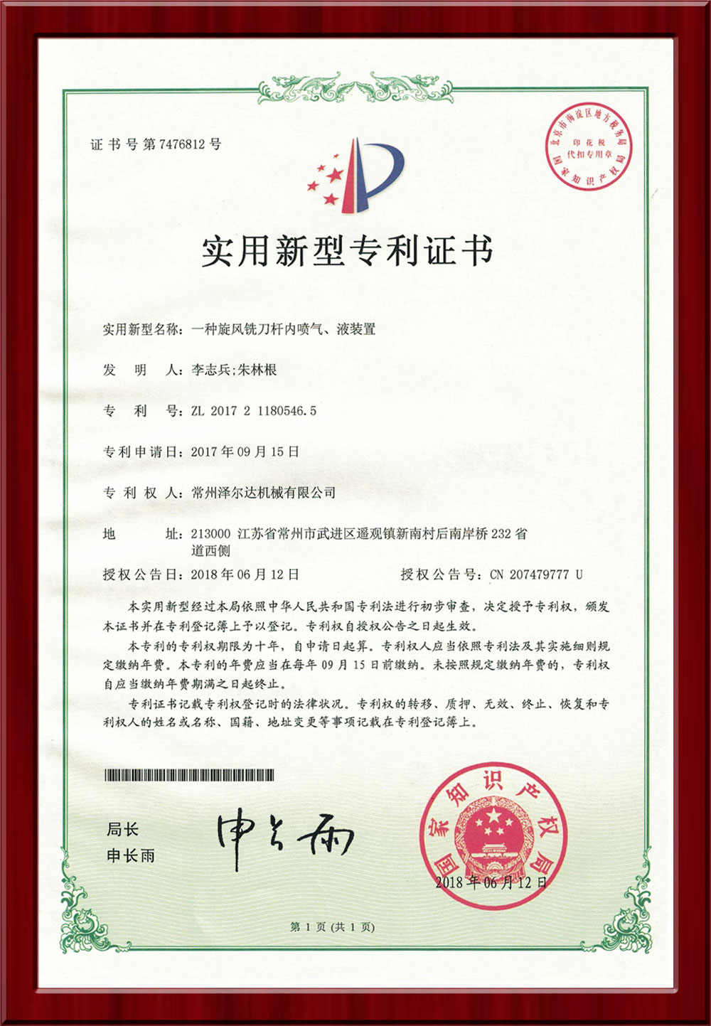 • 7476812實(shí)用新型專利